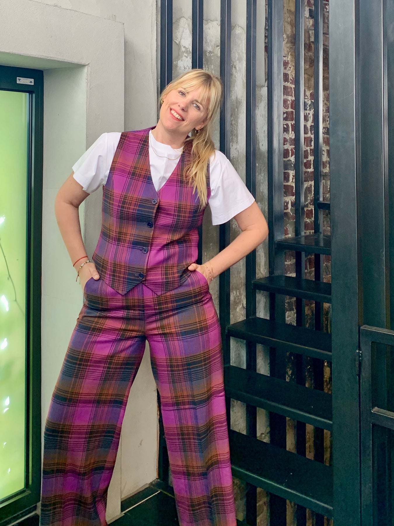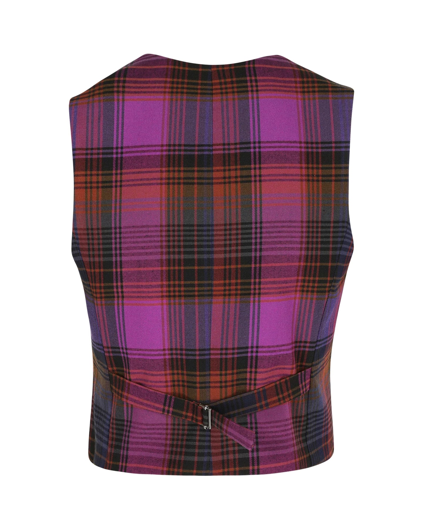 Getailleerd gilet in een levendige ruit met fuchsia, oranje en nachtblauw.De aangesloten snit geeft structuur en accentueert de taille.