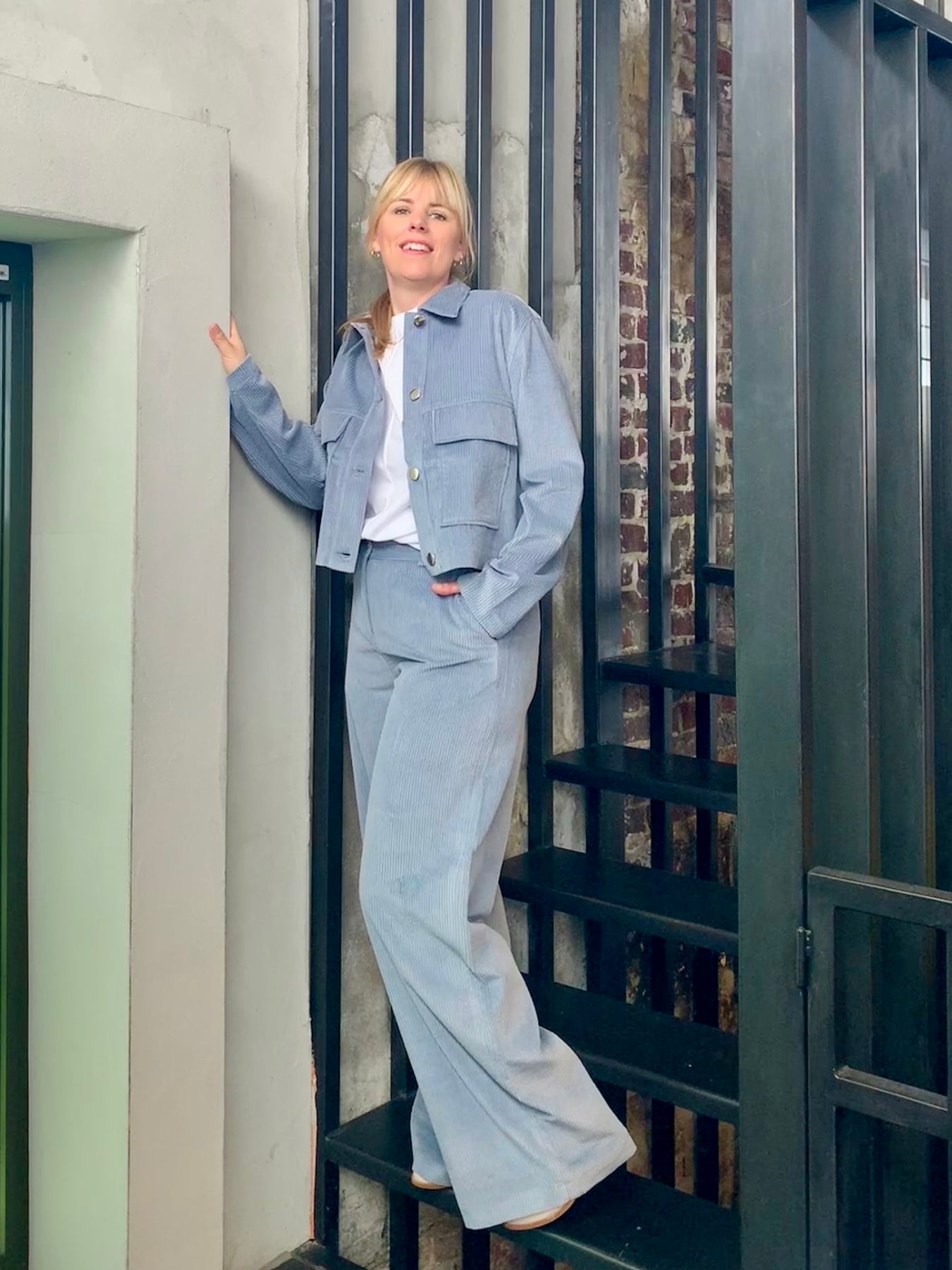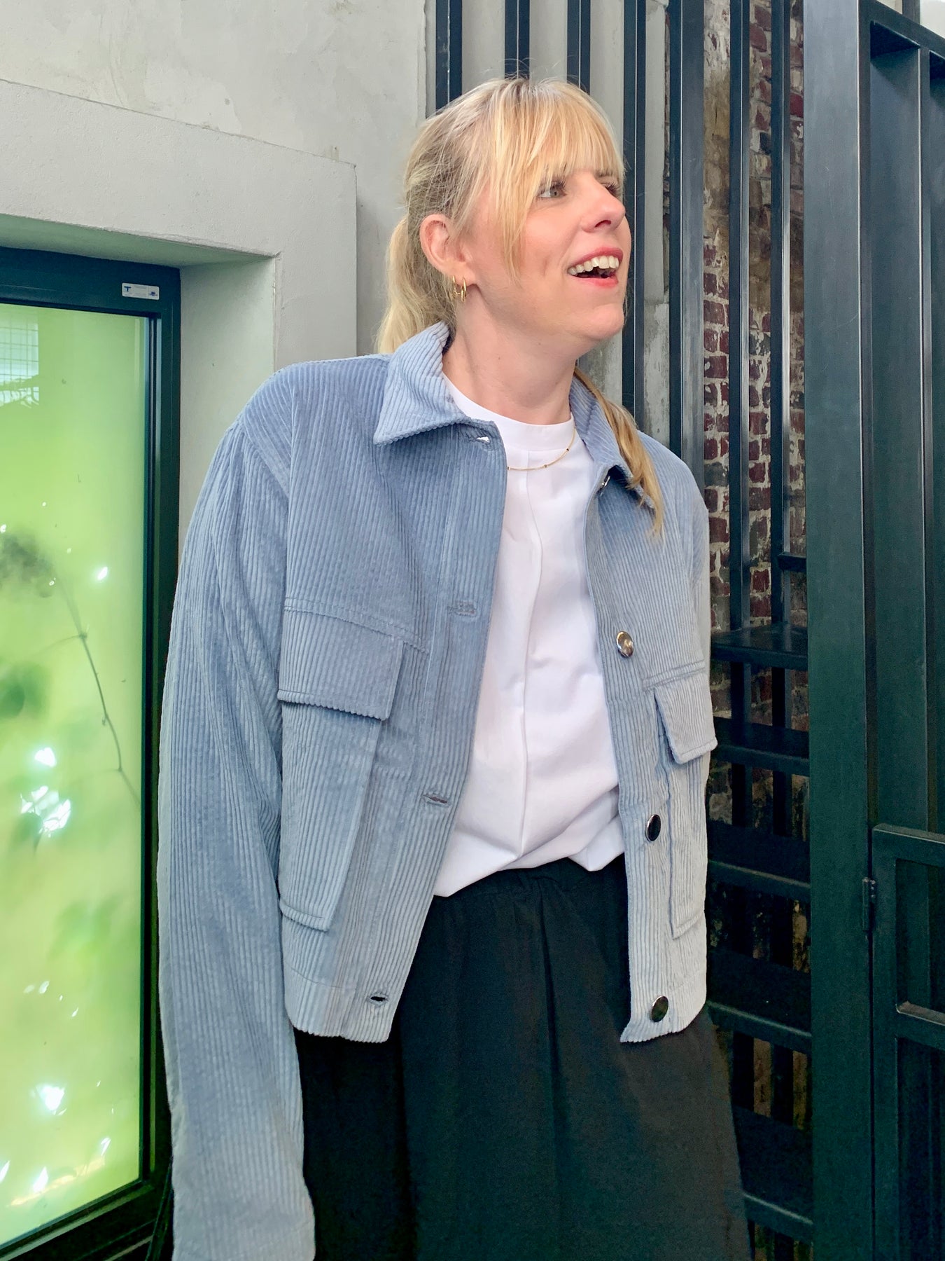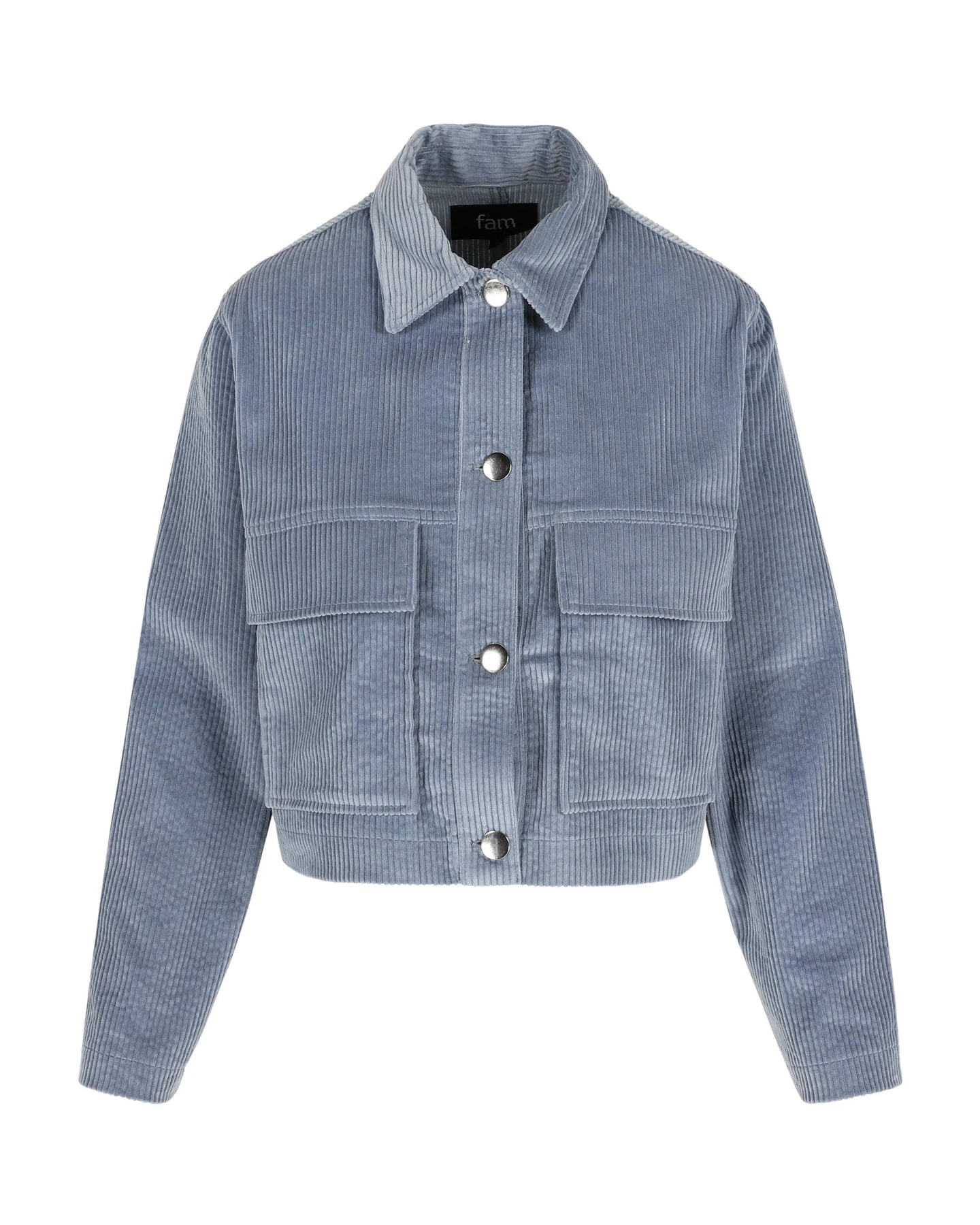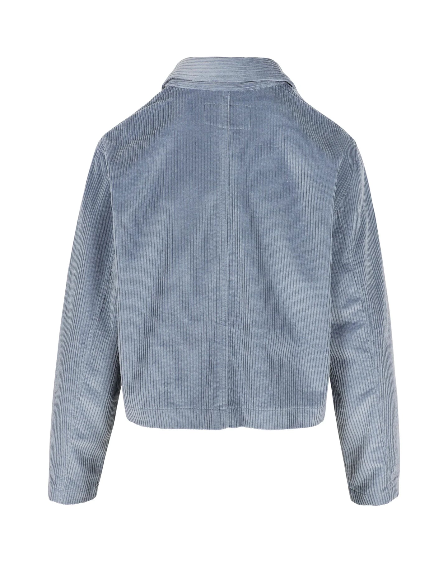 Kort jasje in een zachte blauwgrijze ribfluweel. De boxy, cropped fit en oversized zakken geven een moderne en nonchalante look.
