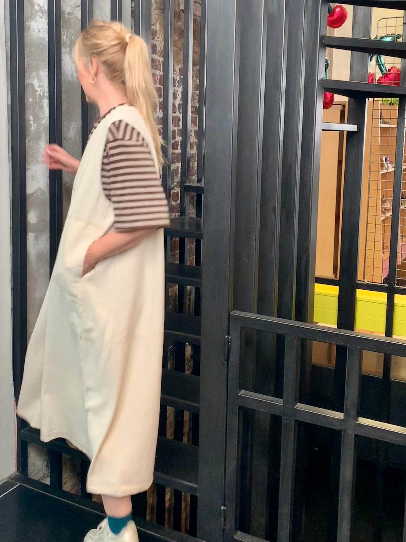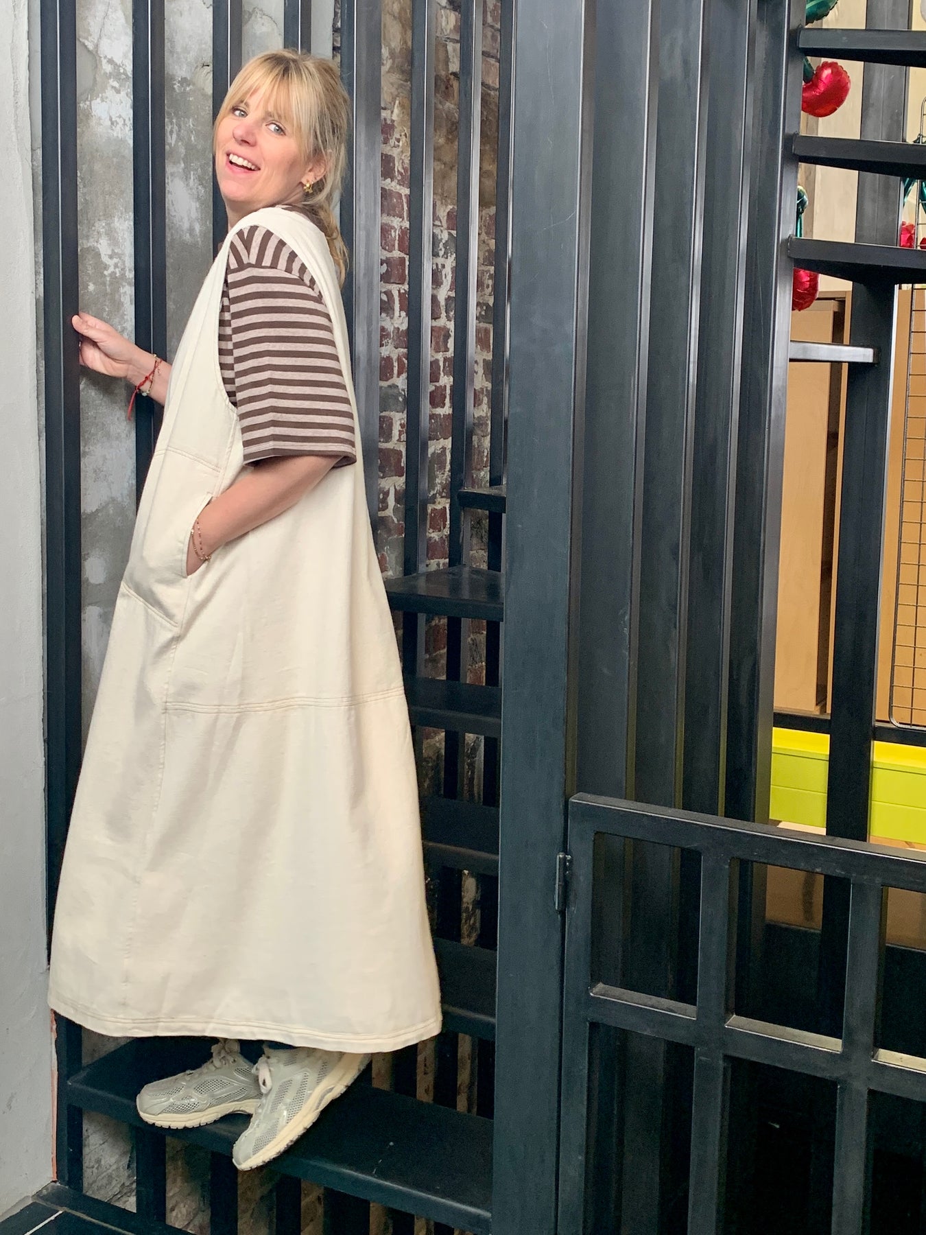 Een jeansjurk die niet schreeuwt, maar gewoon doet waar ze goed in is: comfort, stijl en nonchalant cool combineren. Deze maxi jurk in stevig 100% katoen voelt als thuiskomen op drukke dagen. Losjes, luchtig en met een knipoog naar workwear dankzij de opvallende stiksels en diepe zakken.