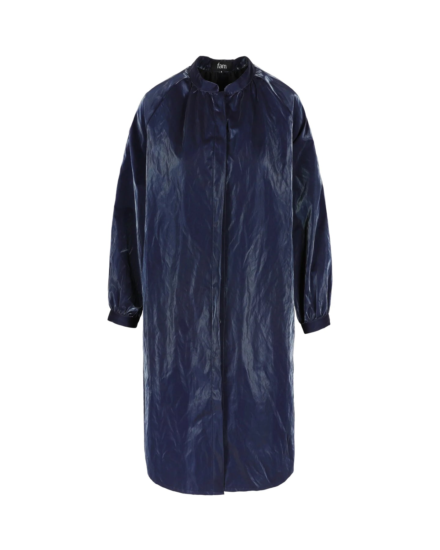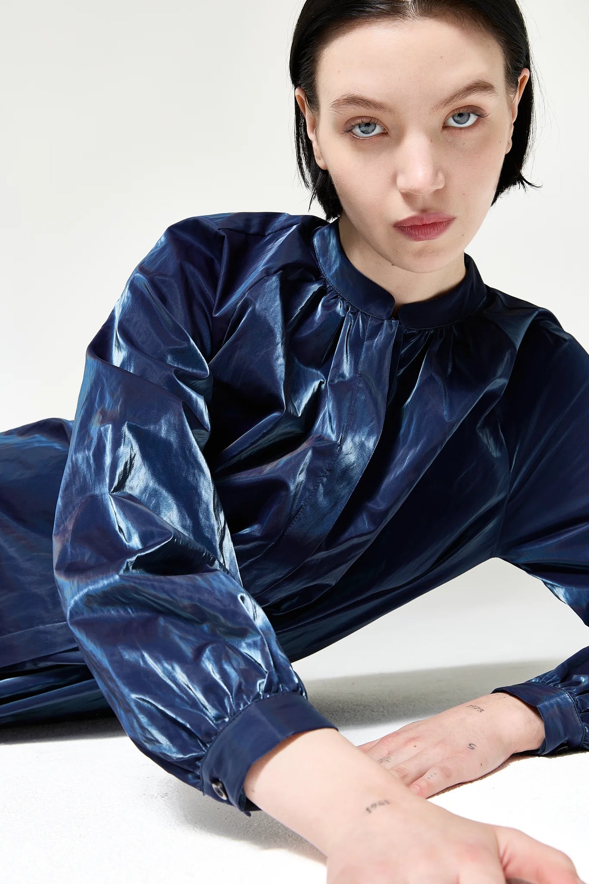 Glanzende jurk in een diepblauwe stof die het licht én de aandacht vangt (en ja, ze is gewoon wasbaar). De lengte valt net onder de knie, met zachte volume in schouders en mouwen voor een moderne, sculpturale look.