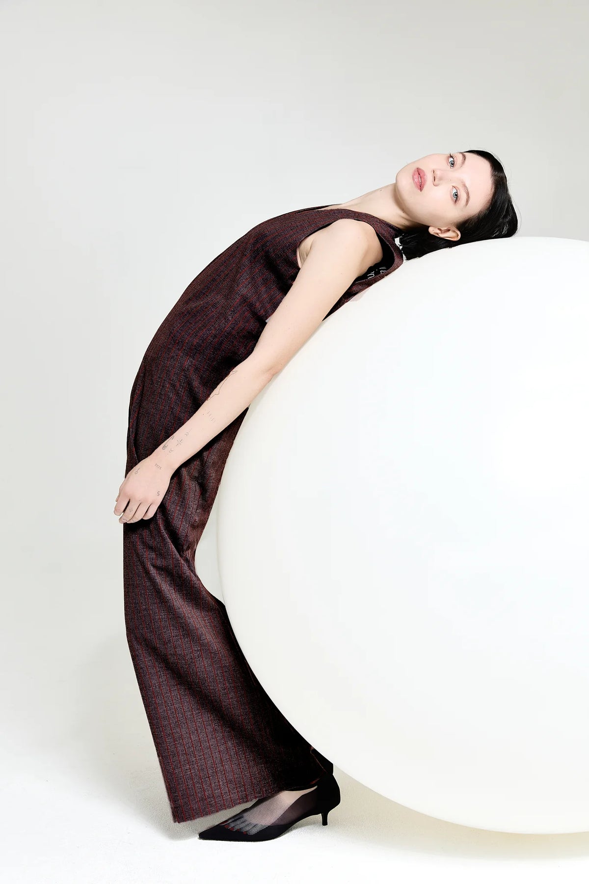 Wear. repeat. love. Deze wide-leg jumpsuit is gesneden uit een diepe bordeauxrode wolmix met een subtiel paars pinstripe detail. Het mouwloze model is volledig gevoerd, zodat hij heerlijk comfortabel zit en toch elegant valt.