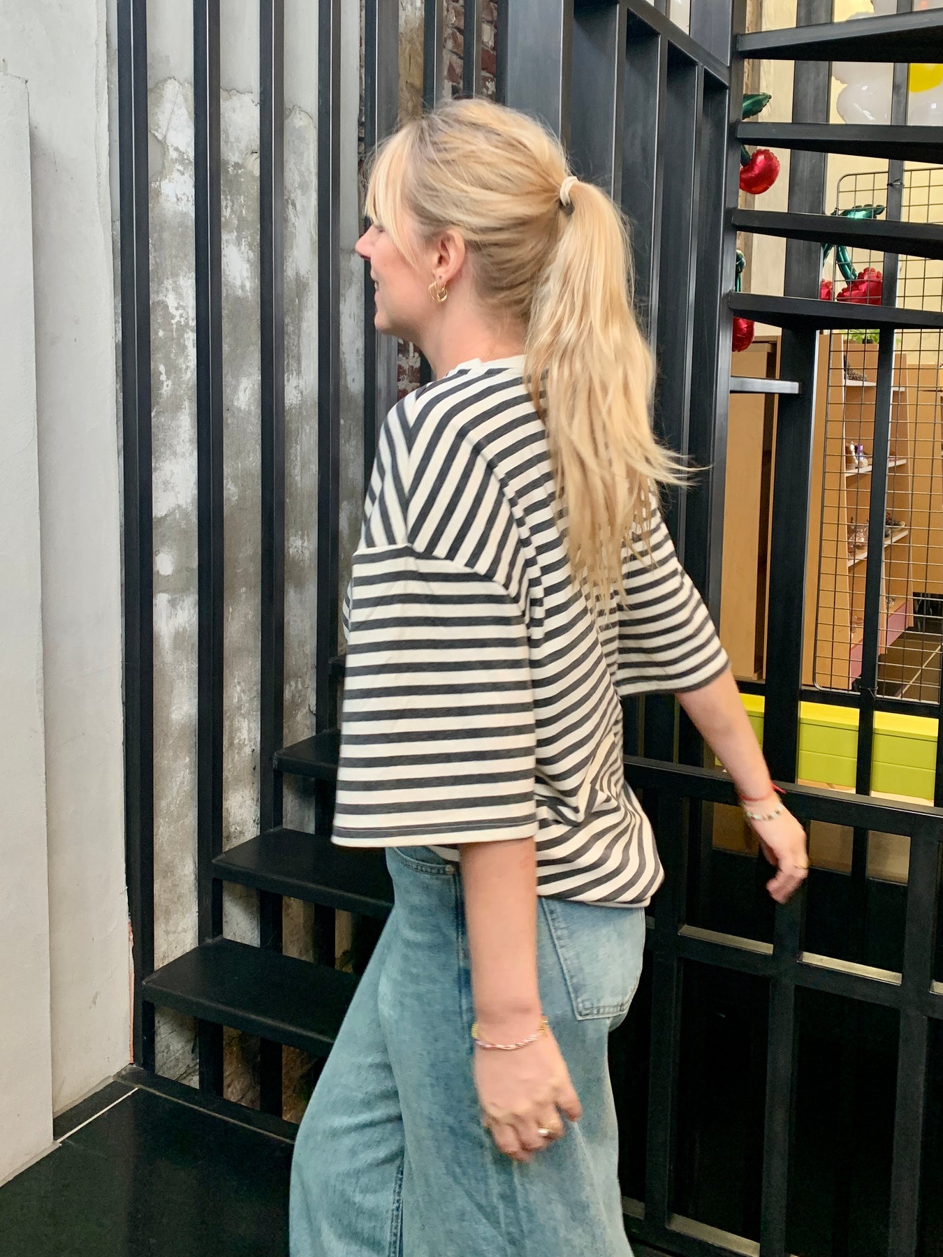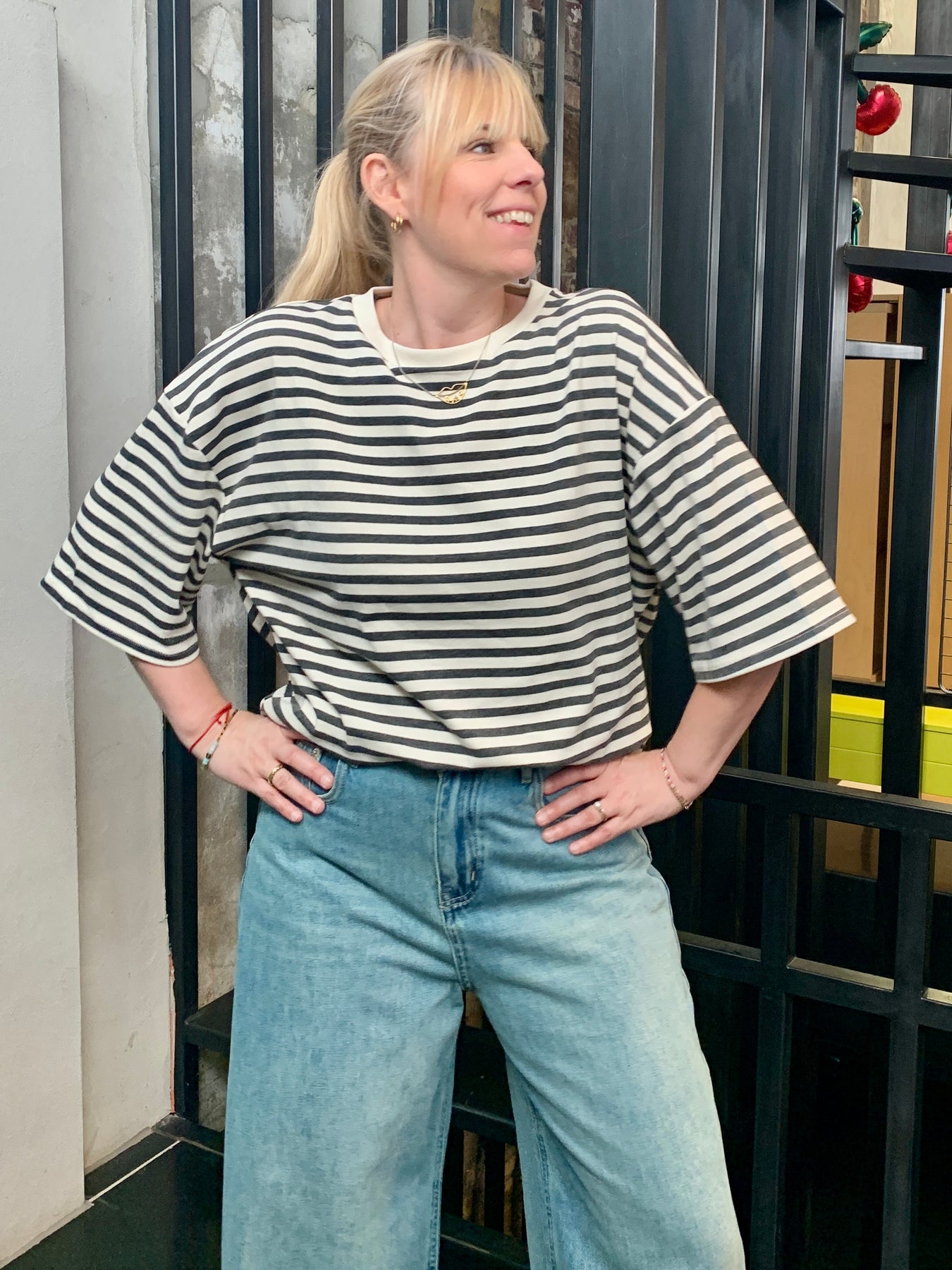 Gestreepte T-shirt in puur katoen Dezelfde comfy vibe als de longsleeve, maar dan in een luchtige korte mouw. Gemaakt van 100% katoen in een zalige kwaliteit die soepel valt en ademt. De zwart-witte streepjes geven je outfit instant een frisse, casual look. Perfect om te dragen op een jeans, short of onder een blazer.