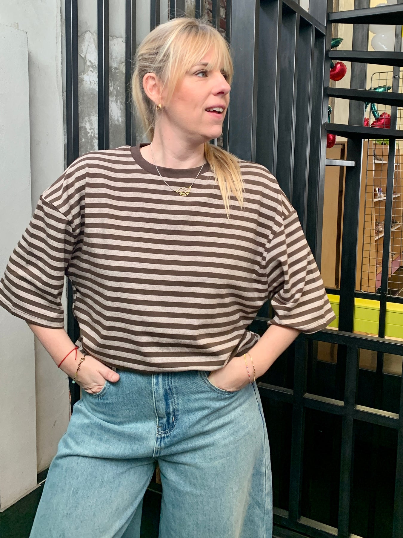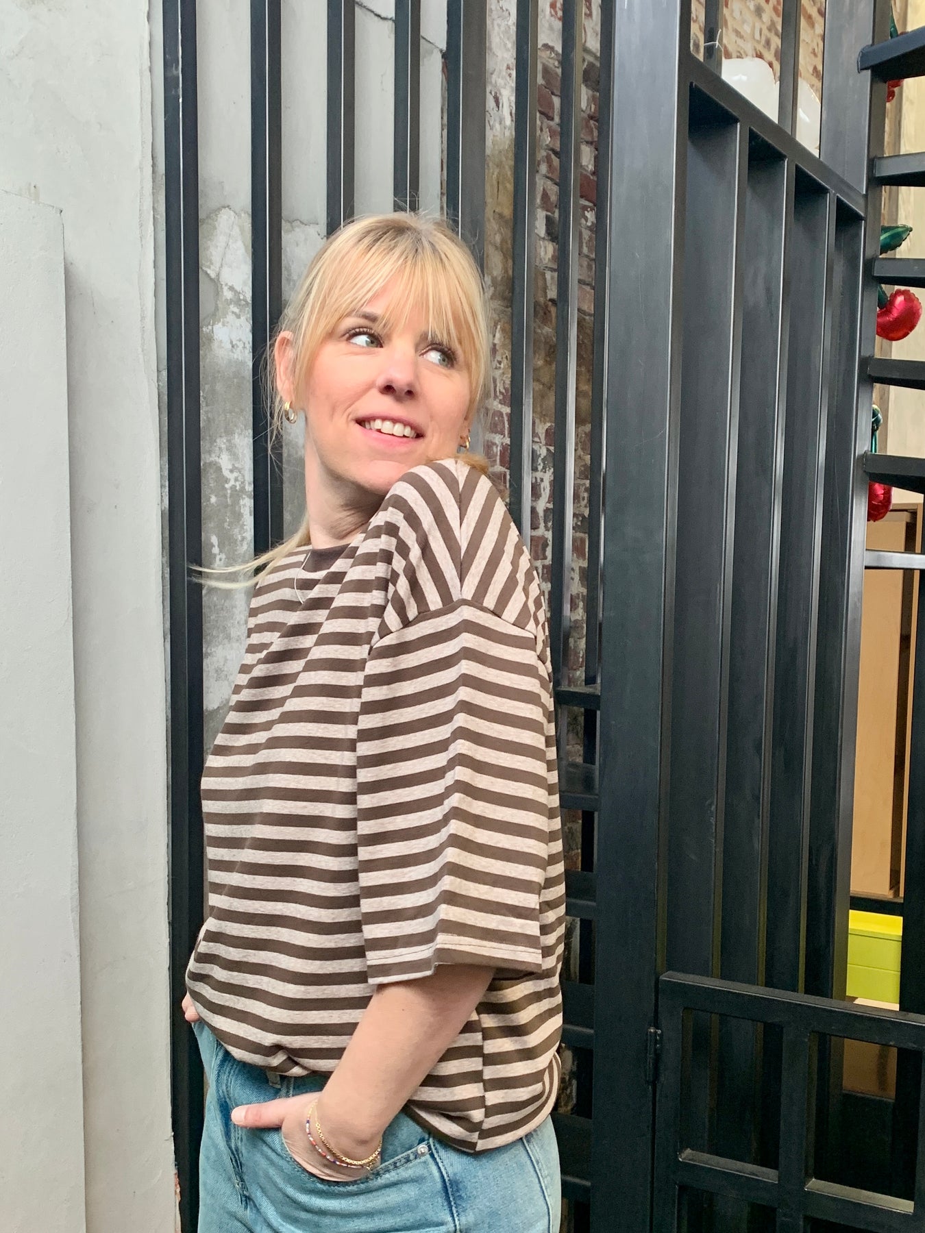 Gestreepte T-shirt in puur katoen Dezelfde comfy vibe als de longsleeve, maar dan in een luchtige korte mouw. Gemaakt van 100% katoen in een zalige kwaliteit die soepel valt en ademt. De chocolade streepjes geven je outfit instant een frisse, casual look. Perfect om te dragen op een jeans, short of onder een blazer.