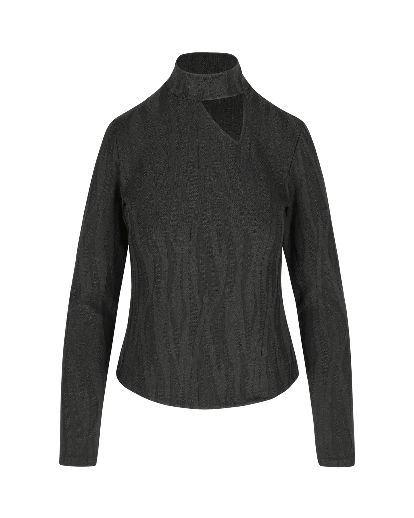 Deze elegante top heeft een verfijnde ingeweven print en voelt stevig én tijdloos aan. De verhoogde halslijn met speels cut-out detail maakt hem net dat tikkeltje bijzonder. Dankzij de slanke pasvorm volgt de top mooi je silhouet.